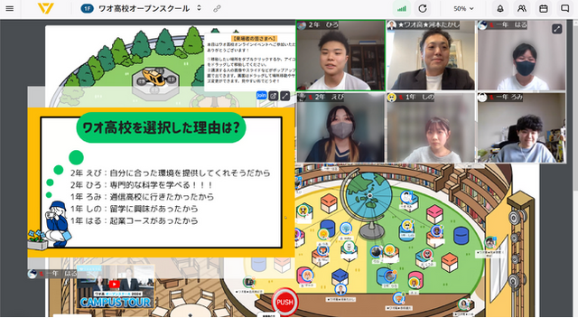 転入でワオ高校を選んだ2年生2人は「全日制高校に比べて、自分に合った環境を提供してくれそうだったから」「ワオ高校独自科目で、科学を専門的に学べるところが面白そうだと思った」と、決め手となった点を話しました。新入学で入った1年生3人の選択理由も、それぞれ異なりユニークです。「もともと通信制高校に行きたくて、先生が優しそうで雰囲気が良かったから」「自由な時間を使って自分のスキルを伸ばし、留学に挑戦したいと思った」「起業を学べる学校を探してワオ高校がぴったりだった」など、自分の「好き」を追求できる学校選びをした結果、ワオ高校にたどりついているようです。