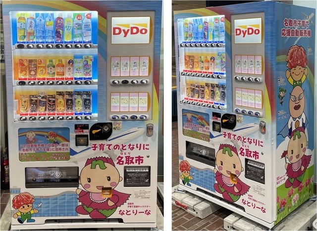 さらに、本自販機は、同市のマスコットキャラクター「カーナくん」や「なとりーな」などを施し、ご利用されるお客様により親しんでいただきやすいデザインとしており、飲料や紙おむつを購入する以外の楽しみも提供いたします。