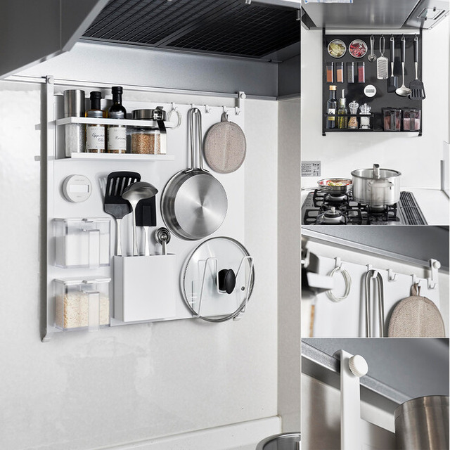 コンロ周りの壁面をマグネット収納空間に。