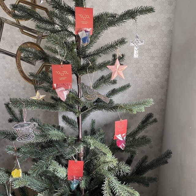 クリスマス限定の赤いタグのこうぶつヲカシと世界中から集めたリボンやパーツを扱う店【Dua】がセレクトしたこだわりのオーナメントがセットに。