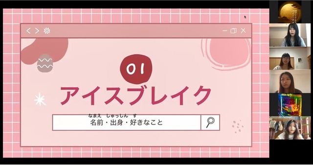 前回(2021年8月)の「オンライン国際交流イベント」は中国や韓国など、東アジア在住の日本語学習者を対象にしたもので、本学の学生が企画・運営しました。「日本語スモールグループ・コミュニケーションD」では、前半部分でグループコミュニケーションの基礎を学んだ上、1時間程の国際交流企画を考案し、実際に運営を行いました。