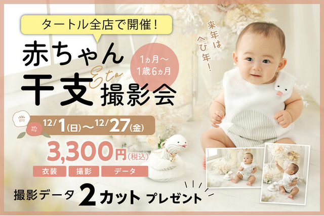 東海地方でフォトスタジオを20店舗運営する株式会社タートル(本社:愛知県春日井市、代表取締役社長:亀山直樹)は、2024年12月1日(日)より、へびのオリジナル着ぐるみ衣装での撮影を2カット3,000円(税込3,300円)で提供するキャンペーン「赤ちゃん干支撮影会」を全店で開催します。