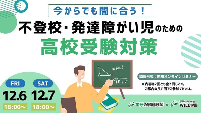 株式会社 学研ホールディングス(東京・品川/代表取締役社長:宮原博昭)のグループ会社、株式会社 学研エル・スタッフィング(東京・高田馬場/代表取締役社長:伊藤弘雅)は、展開する「学研WILL学園」「学研の家庭教師」でこの時期にご相談が増える「高校受験に向けた準備や取り組み」について分かりやすく解説するため、2024年12月6日(金)と12月7日(土)に「今からでも間に合う! 不登校・発達障がい児のための高校受験対策」無料オンラインセミナーを開催いたします。