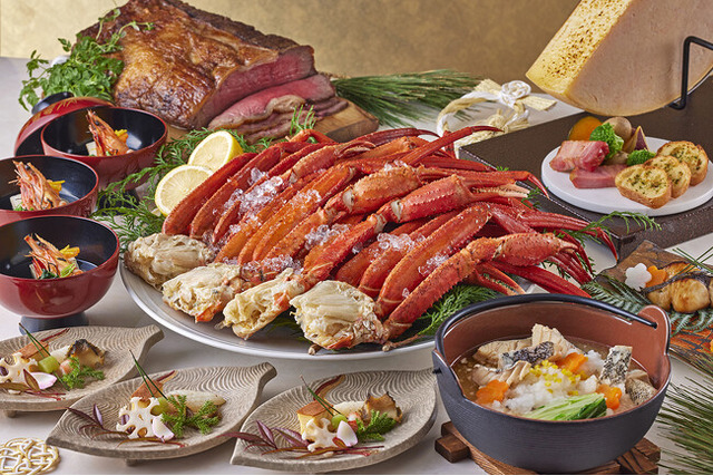ブッフェテーブルには、甘みのある身がしっかりと詰まった「本ズワイガニ」の食べ放題をはじめ、ジューシーに焼き上げた牛肉を3種のソースで楽しめる「牛肉のグリルステーキ」「昆布〆ブリたたきのカルパッチョ仕立て」などの洋食から、胡麻味噌仕立ての「鮟鱇鍋」や「祝肴」「おせち料理」などの日本料理、「苺のショートケーキ」「黒ゴマプリン」などのデザートまで、豪華なメニューがずらりと並びます。