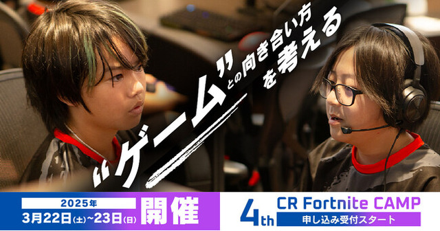 株式会社Game & Co.(本社:東京都港区、代表取締役:星 崇祥、読み:ゲームアンドコー、株式会社Brave group100%子会社、以下「Game & Co.」)は、人気プロゲーミングチーム「Crazy Raccoon(クレイジーラクーン)」と共同で、2025年3月22日(土)・23日(日)の2日間に分けて、小学生から高校生向けのesportsプロゲーマー体験キャンプ『CR Fortnite CAMP』の第4回を開催いたします。また、11月22日(金)13時より先着順で参加の申込受付を開始いたしました。