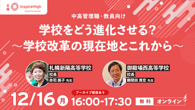「世界とつながる探究的な学びを手軽に教室で」をコンセプトとしたEdTech教材を提供する株式会社Inspire High(本社:東京都千代田区、代表:杉浦太一)は、"学校改革"をテーマにした、中高管理職・教員向けのオンラインセミナーを12/16(月)に開催します。