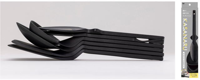 今回登場する「kasanaru」は、収納場所に困りがちなキッチンツールを、重ねてコンパクトに収納できます。製品ラインナップは、スプーン、レードル、ヘラ、ターナー、トングの5種類と、全てがセットになった5本セットの6種類です。