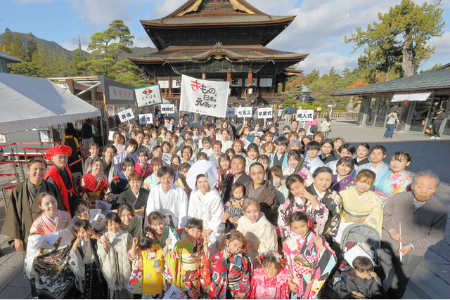 当日は、3歳から83歳までのおよそ120名の方がきもの姿で長野市の権堂や善光寺を散策しました。