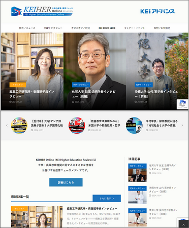 KEIアドバンスでは、大学経営・研究に関する情報発信サイト『KEI Higher Education Review』を2023年7月にオープンし、大学関係者にとって有益なさまざまな情報をご提供してきました。今回、大学だけではなく、高等教育機関全般に関する有益な情報を発信する新しい“オンライン教育ニュースメディア”として大きくリニューアルし、サイト通称も『KEIHER(ケイハー)Online』としました。