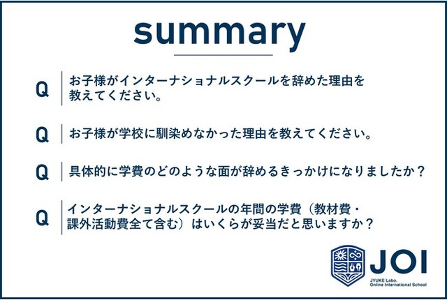じゅけラボOnlineインターナショナルスクールJOI(所在地:大阪市北区、代表取締役:後藤智則)は、インターナショナルスクールを途中退学した経験がある子どもの保護者200人に、退学の主な理由について、その詳細のアンケート調査を実施しました。