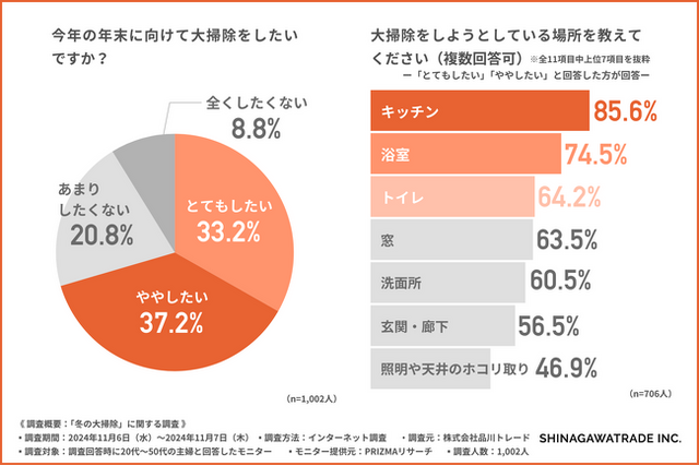 約7割の主婦が年末の大掃除をしたいと考えており、年末の大掃除は新年を迎えるための重要な行事として捉えられていることが判明しました。中でも、キッチンが重点エリアとしてあげられました。キッチンは使用する頻度が高く、油汚れや食材のカスが蓄積しやすいことが理由の一つだと推察されます。