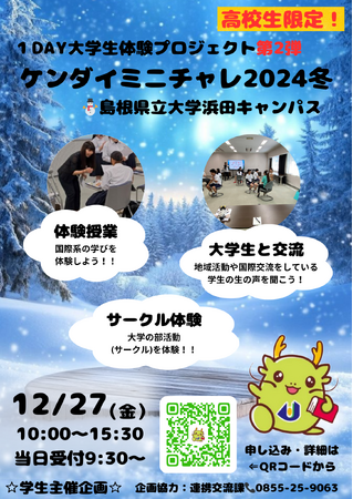 令和6年12月27日(金)に、1DAY大学生体験プロジェクト第2弾「ケンダイミニチャレ2024冬」を開催します。これは県内高校に通う高校生を対象に、大学は自分のやりたいことを実現するための場であり、大学生との交流を通して大学を体験してもらいたい、と本学学生が企画しました。