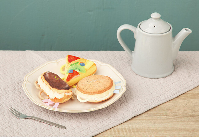素材:《フルーツタルト》ポリエステル、ポリウレタン、ポリスチレン、綿、ナイロン 《クッキーサンド》ポリエステル、ポリウレタン、ポリスチレン、綿、ナイロン 《エクレア》ポリエステル、ポリスチレン、綿、ナイロン