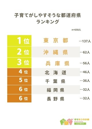 今回、株式会社AZWAY(https://azway.co.jp/)が運営する、幸せおうち計画(https://azway.co.jp/media/)は、10代から60代以上までの658人を対象に「子育てがしやすそうな都道府県」についてアンケート調査を実施しました。