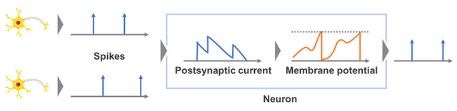 隠れ層を一層持つ学習後のSNNの時間発展を示している。最上段の図は発火時刻に符号化された入力スパイクの時刻をプロットしている。上から2番目の図は、ある隠れ層ニューロンの膜電位(橙色実線)とシナプス電流(青色破線)の時間発展を示している。ニューロンは発火後もシナプス電流を保存し、複数回発火している。上から3番目の図は、複数の隠れ層ニューロンの膜電位の時間発展を示している。最下段の図は、出力層ニューロンの膜電位の時間発展を示しており、処理終了時刻(この場合t=1.0)の各出力層ニューロンの膜電位を出力値としている。このモデルでは、出力層が発火しないことに留意されたい。