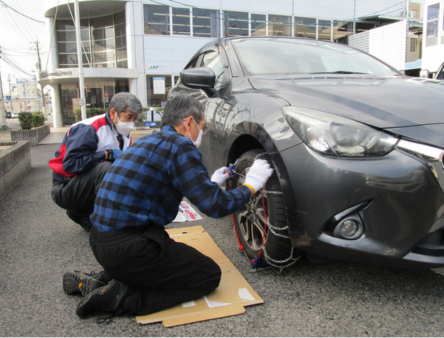 本教室は、冬季の交通安全を確保するための取り組みの一環として開催しており、降雪時に備えてご自身でタイヤチェーンの取り付けができるようにJAFインストラクターとマンツーマンで取り付け方法を確認し、アドバイスをおこないます。