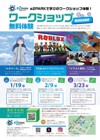 e2PARK滋賀東近江店はプログラミングスクールの他、様々な「学び」のきっかけづくりの場を提供します。子どもたちの将来への職業選択の幅を広げたり、やりたいことを見つける機会を多くつくることを目的にワークショップを開催します。また、大人向けワークショップもあり、社内や実生活で役立つスキルを一緒に学んでいくことができます。