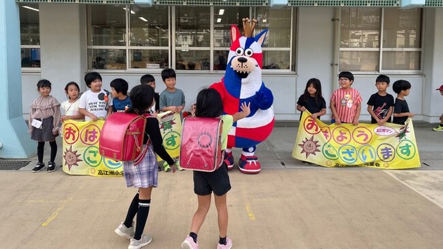 「おおきなわ」の活動の一環として行なっている「ゴーディーによる朝のあいさつ運動」で、11月はホームタウンの沖縄市、うるま市、浦添市の小中学校のあいさつ運動に参加しました。