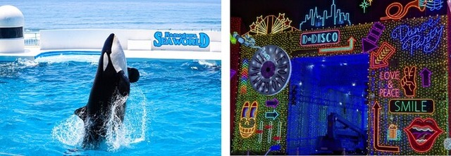 「オルカ&スマイル」は鴨川シーワールドと東京ドイツ村のどちらも楽しめるお得な2施設コラボプランです。今年で19年目を迎える東京ドイツ村のウインターイルミネーションは『ギラギラ光響曲』をテーマに開催され、「光と音のドローンショー」をはじめ90年代以降に大流行した音楽を楽しめる「レッツダンス!ディスコ」やイルミで遊べるインタラクティブスポットなど、エリアごとに多彩な色と音楽を楽しめる仕掛けが散りばめられた関東最大級のスケールを誇るイルミネーションをお楽しみいただけます。