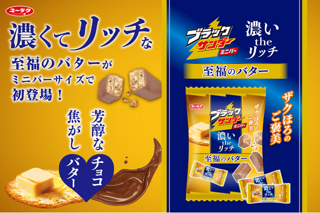有楽製菓株式会社(本社:東京都小平市、代表取締役社長 河合辰信)は、厳選素材とチョコレートが生み出す濃厚でリッチな味わいを楽しめる「濃いtheリッチ」シリーズから「ブラックサンダーミニバー 至福のバター」を2024年12月2日(月)より全国のスーパーマーケット、ドラッグストアなどで発売いたします。