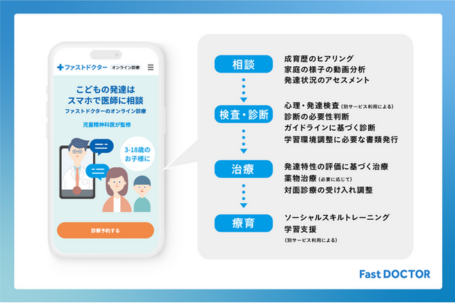 ファストドクター株式会社(本社:東京都渋谷区 代表取締役:菊池 亮(医師)、水野 敬志)と提携医療機関は、子どもの発達障害に関する診療待機が長期化している現状を踏まえ、オンラインでの相談・診断が可能なサービス「小児発達オンライン」を2024年12月2日より開始いたします。