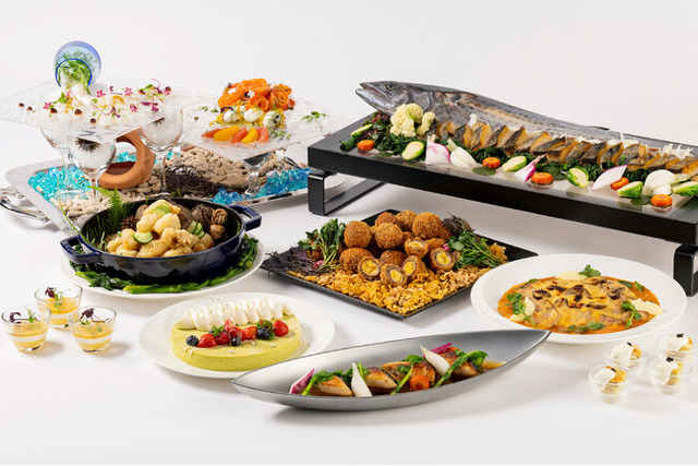 ほかにも、淡路牛のハンバーグパテにうずら卵を入れパン粉をつけて揚げた、大人にも子供にも好まれているイギリス発祥のスコッチエッグや、春を告げる魚と呼ばれ、文字にも春が用いられ一年で最も秋冬が美味しいと言われている鰆に、緑鮮やかな春菊のソースをたっぷりと纏った「鰆の春菊香るナージュ 白菜のエチュベ」をご用意。身が柔らかいことで知られている水たこに香草をまとわせ柚子胡椒風味の「たこの香草マリネ柚子胡椒風味」、たっぷりの柑橘でマリネした「サーモンマリネ カリフラワーのクスクス風添え」など、冬限定のメニューを多数取り揃えております。