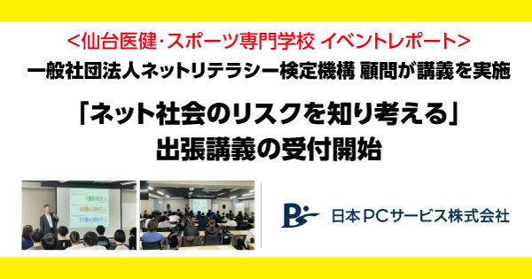 デジタル機器の設定・トラブル解決を行う日本PCサービス株式会社(本社:大阪府吹田市、代表取締役社長:家喜 信行、証券コード:6025、以下「当社」)は、一般社団法人ネットリテラシー検定機構(以下「ネットリテラシー検定機構」)と協力し、仙台医健・スポーツ専門学校にて、2024年9月20日(金)に、ネット時代を生きる学生たちのための特別講義を実施したことを報告します。講義は学生・教職員向けの2部構成で実施しました。また、今回受講した学生・教職員からの反響を受け、同様の悩みを持った団体・教育機関に対し出張講義の受付を11月28日(木)より開始いたします。