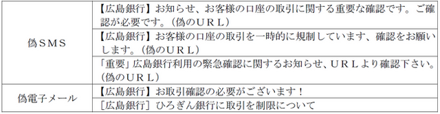 株式会社広島銀行(代表取締役頭取 清宗 一男)では、11月23日(土)18時頃、当行を装った偽SMS(ショートメッセージ)・偽サイトが確認されました。その後、新たな手口が確認される中、不正送金被害が拡大していることを受け(約4千万円/11月27日20時現在)、再度の注意喚起としてお知らせいたします。(本件については、11月25日のリリースと一連の内容になります。)