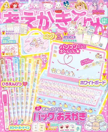 『おえかきひめ』は、おえかきやぬりえ、めいろ、まちがいさがし、おりがみ、紙工作など、子どもたちに大人気の遊びを、かわいいキャラクターたちとたっぷり楽しめる雑誌です。