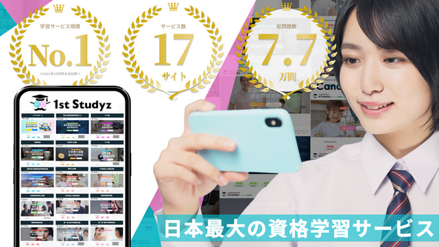 「過去問 1st Studyz」は取り扱いサービス数17サイト、7.7万問が全て無料、累計利用者数80万人を突破しました。時間や場所を問わず、パソコンやスマートフォンから気軽に資格学習できる全問プロによる解説付きの無料サービスで、移動の合間や寝る前のたった数分に1クリックで勉強することができます。