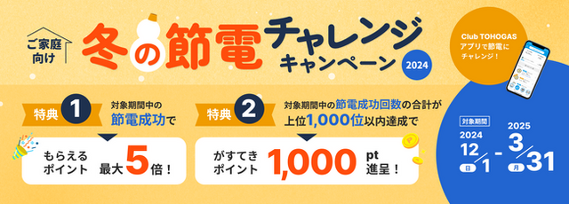 東邦ガス株式会社(社長:増田 信之)は、2024年12月1日~2025年3月31日の期間で、電気のお客さま向けに、「冬の節電チャレンジキャンペーン2024」(以下、節電チャレンジキャンペーン)を実施します。
