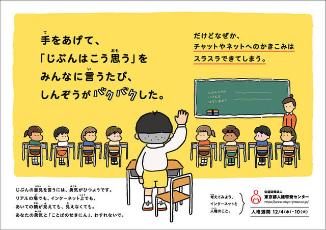 作成したポスターは人権尊重思想の普及高揚を図るため国際連合が定めた「人権デー」(12月10日)に基づき、日本各地で様々なキャンペーンが行われる12月4日から10日までの「人権週間」を中心に、東京都内の交通機関や小中学校など教育機関に掲出されるほか、人権週間に限らず通年用としても掲出される予定です。