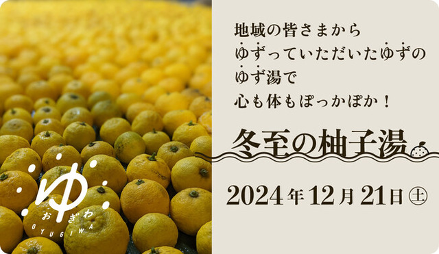 株式会社イオンファンタジ(ー本社:千葉県千葉市、代表取締役社長:藤原徳也)が運営する神奈川県海老名市、静岡県浜松市の温浴施設「OYUGIWA 海老名」と「OYUGIWA 浜松市野」は、2024年12月21日(土)の「冬至の日」に、地域のお客さまから「ゆずって」いただいた柚子を使用した「冬至の柚子湯」を実施いたします。
