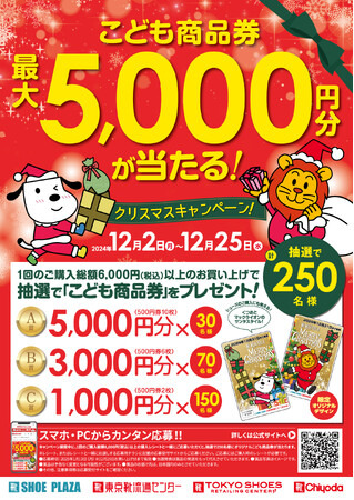 株式会社チヨダ(東京都杉並区 代表取締役社長 町野 雅俊)は、12月2日(月)より、全国のシュープラザ、東京靴流通センター他全店舗と、公式オンラインショップ「kutsu.com」でチヨダオリジナルキャラクターの『くつお』と当社「おもちゃのハローマック」のキャラクターの『マックライオン』がデザインされた「こども商品券」が、抽選で250名様に当たる「クリスマスキャンぺーン」を開催いたします。