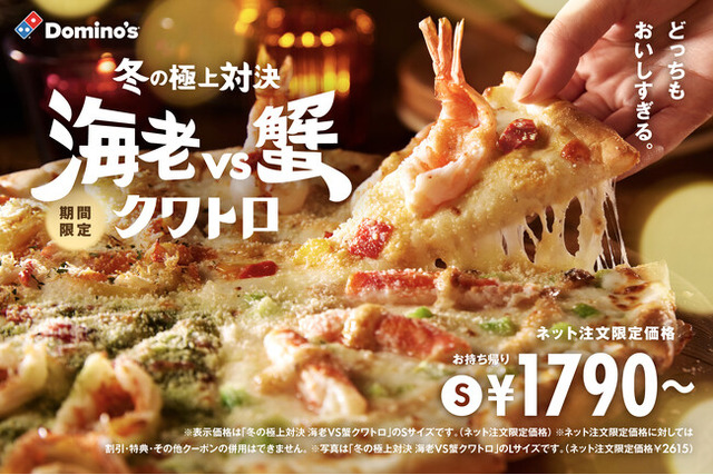 クリスマスや年末年始など、人と集まる機会の多い冬の食卓では、みんなで楽しめる、特別なごちそうが食べたくなります。そんな特別な機会に、ぴったりな冬季限定のピザをお届けしたい、という思いからドミノ・ピザは、見た目も豪華で特別な日にぴったりな「海老」と、冬の定番で贅沢な気分を味わえる「蟹」を一度に両方楽しめる「海老vs蟹 クワトロ」を2024年12月2日(月)~2025年1月13日(月・祝)までの期間限定で発売します。