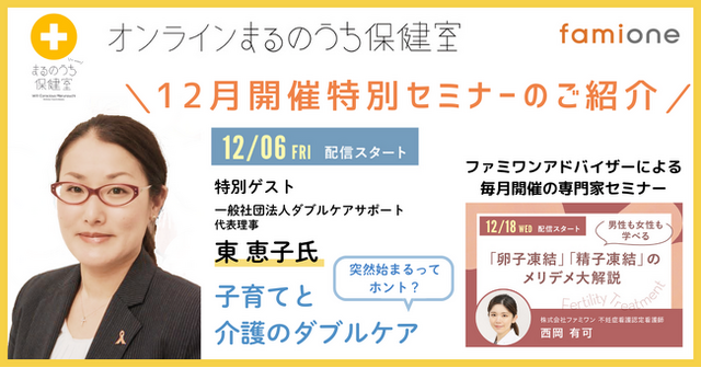 12月のオンラインセミナーには、一般社団法人ダブルケアサポート 代表理事 東 恵子氏、株式会社ファミワンの胚培養士と、不妊症看護認定看護師 西岡 有可が登壇します。