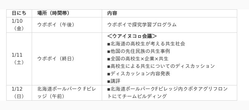 公益財団法人アイヌ民族文化財団(札幌市中央区:常本照樹理事長)が運営するウポポイ(民族共生象徴空間)は、「ウポポイ誘客促進戦略」(令和6年3月国土交通省北海道局)に基づいて、全国からウポポイに高校生が集まり「共生社会」について考える1日会議“ウアイヌコㇿ会議”を1月11日(土)にウポポイで開催します。この度、本会議に参加する道内および道外の全14校が決定いたしました。あわせて、本イベントへの視察も募集いたします。