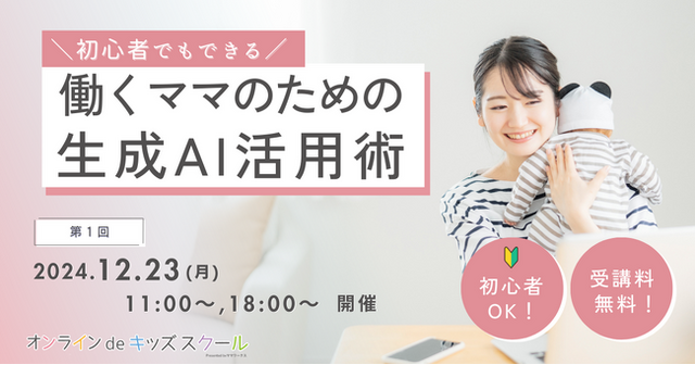 株式会社アイドマ・ホールディングス(本社:東京都品川区、代表取締役:三浦 陽平、以下:当社)が運営する在宅ワーク求人サイト「ママワークス」は、「初心者でもできる!働くママのための生成AI活用術」のオンライン講座を2024年12月23日(月)に開講します。本講座は、国内最大級のAI活用コミュニティ「SHIFT AI」でも活躍中の講師をお招きし、ママワークス会員限定で完全無料で開催します。