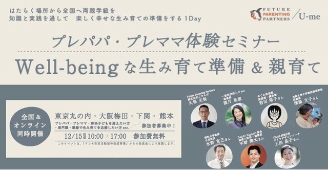この活動の一環で、2024年12月15日(日)にイベント「Well-beingな生み育て準備&親育て」を、東京、大阪、下関、熊本の4会場で同時開催します。
