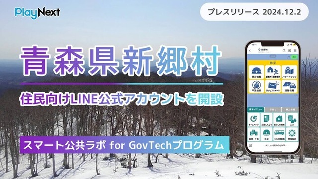 プレイネクストラボ株式会社(本社:東京都品川区、代表取締役:柏 匠、以下 「プレイネクストラボ」)は、合同会社DMM.com(本社:東京都港区、会長 兼 CEO:亀山敬司、以下「DMM」 )との協力により、青森県新郷村(以下「新郷村」)のLINE公式アカウントを「スマート公共ラボ for GovTechプログラム」を活用して新規開設し、2024年12月2日(月)より運用を開始することをお知らせします。