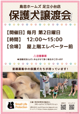 株式会社島忠(本社:さいたま市中央区 代表取締役社長:窪田 光与之 以下:島忠)は、2024年12月8日(日)より、ホームズ足立小台店において保護犬譲渡会を定期開催いたします。