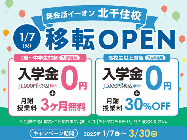 英会話教室を運営する株式会社イーオン(本社:東京都新宿区、代表取締役社長:重野卓、以下「イーオン」)は、2025年1月7日にイーオン北千住校を移転オープンいたします。