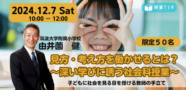 株式会社NIJIN(本社:東京都江東区、代表取締役:星野達郎)が運営する教員研修プラットフォーム「授業てらす」は、筑波大学附属小学校の由井薗健先生の「見方・考え方を働かせるとは?~深い学びに誘う社会科授業~」セミナーを開催いたします。