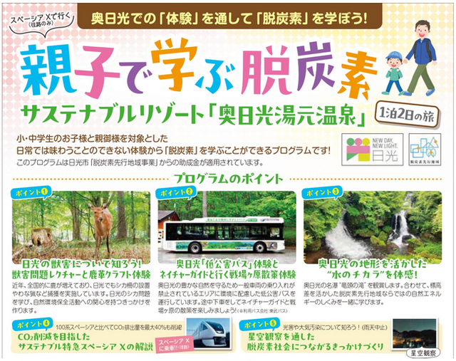 日光国立公園を有する奥日光(湯元地区・中宮祠地区)エリアは、令和5年4月に環境省により『脱炭素先行地域』の一つとして選定されており、本ツアーは日光市と様々な分野の民間企業が連携し、各種プログラムを通じて地域の取組を紹介することで脱炭素に対する理解の深化を目指したもので、ツアーの特徴とポイントはつぎのとおりです。