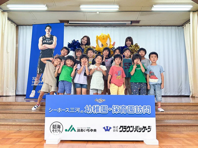 2024年10月16日(水)、シーホースくんとSuper GirlsのHIBIYU、SAYAKAが米津保育園(西尾市)を訪問し、園児の皆さんと一緒にクイズやダンスを楽しみました。