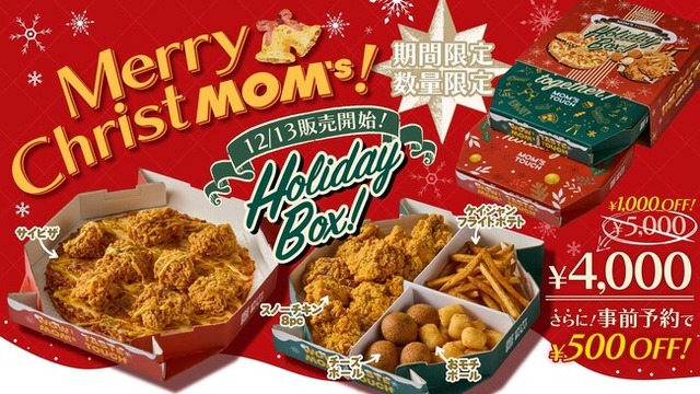 ホリデーシーズンに合わせて発売する「ホリデーボックス」は、日本マムズタッチでは初となる「サイピザ」、「おモチボール」が入っています。さらに、マムズタッチの人気サイドメニュー「チーズボール」や「ケイジャンポテト」、「スノーチキン」も入っておりマムズタッチで人気のメニューをすべて詰め込みました。ホリデーボックスだけでも、パーティーを楽しむことができるほど、ボリュームたっぷりの年末ホリデーシーズン限定の商品です。また、ホリデー気分を感じていただきたいという思いから、赤と緑を使った限定デザインのパッケージにて販売します。家族や友人、恋人と過ごす時間が増える年末に、味もデザインも大満足のマムズタッチ「ホリデーボックス」 をぜひお楽しみください。