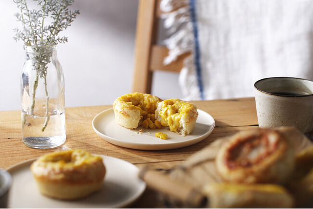 特長: カップ型の生地にコーンのフィリングを溢れる寸前まで絞り、焼き上げました。コク深くなめらかな舌触りのクリームとスイートコーンの組み合わせは、まるでコーンポタージュさながら!生地のフチにトッピングしたパルメザンチーズが香ばしく、塩味のアクセントに。