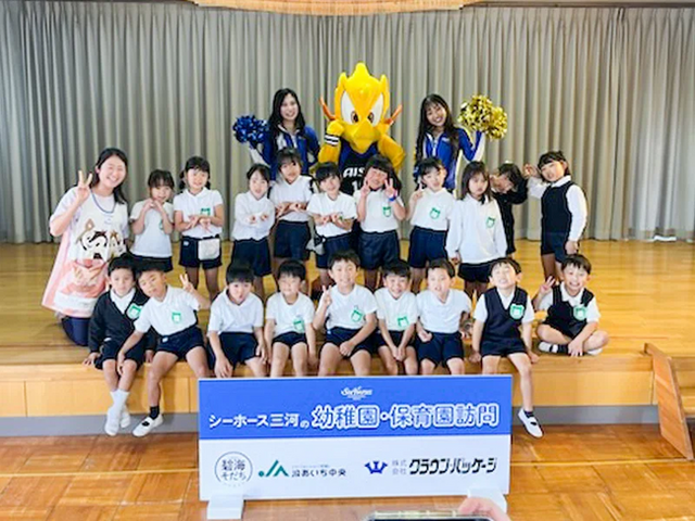 2024年10月22日(火)、シーホースくんとSuper GirlsのKAHO、TOMOMIが嫩(ふたば)幼稚園(岡崎市)を訪問し、園児の皆さんと一緒にクイズやダンスを楽しみました。