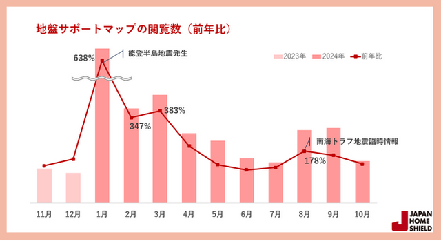 2024年1月~10月の閲覧数は前年比203.1%となり、多くの方が防災意識の高さから、地盤サポートマップで地盤の強度や地震・液状化・ 浸水などのリスクを調べた結果となりました。