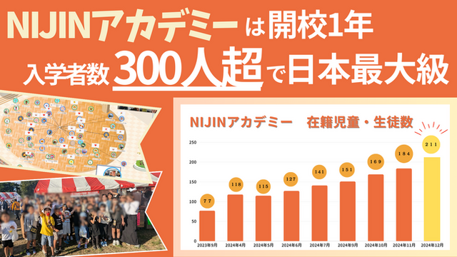 株式会社NIJIN(本社:東京都江東区、代表取締役:星野達郎)が運営する不登校オルタナティブスクール『NIJINアカデミー』は、2024年12月1日現在で入学者数が334名、在籍者数が211名を突破したことをお知らせします。